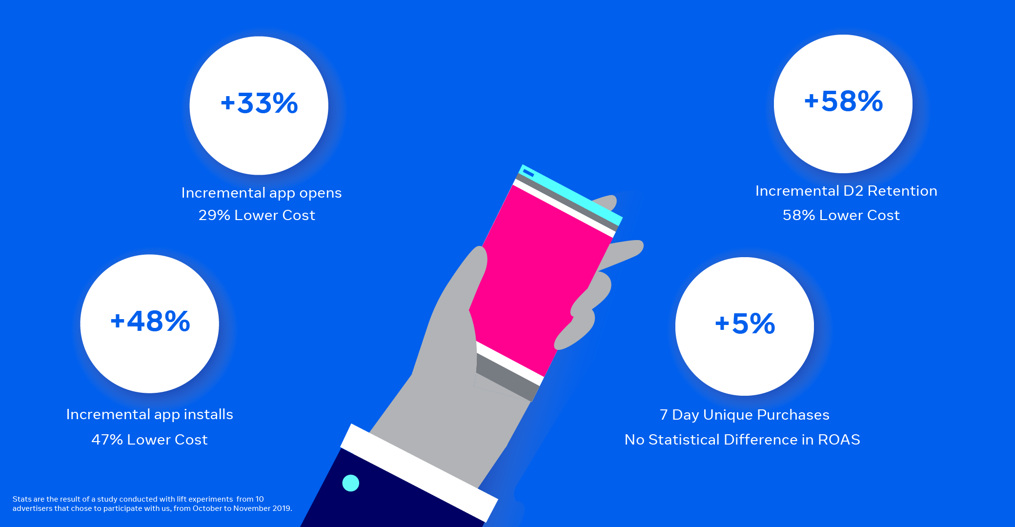 Each study compared a single optimization goal, (Value or App Events), to a diversified optimization strategy (combo of App Installs, App Events and Value Optimization), while holding all other variables (creative, targeting and total budget) constant. In Lift terminology, it was a ‘2 cells’ randomized test and holdout design.